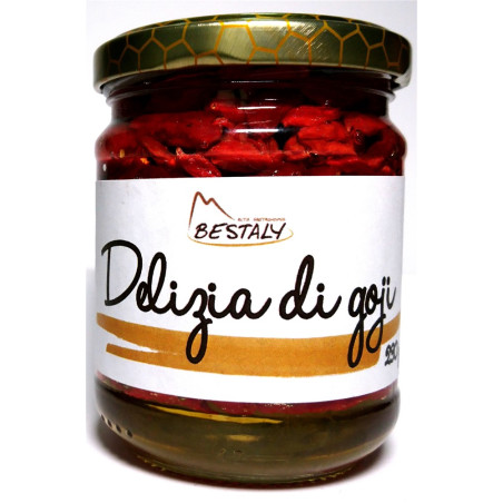 Sweet product composed of top quality artisanal honey and goji berries. Natural and without food preservatives. Specialty with unique characteristics: it helps to improve renal function, liver function and improve visual acuity. Helps normalize lung bronchial secretions and decrease cough. Helps in insomnia states. It can be consumed pure, or added in tea, milk, coffee, instead of sugar and even on bread. Excellent for garnishing desserts, ice creams and drinks.