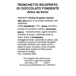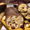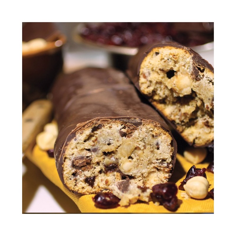 Dolce en une seule pièce de forme allongée à couper en tranches d'ingrédients riches en morceaux enrobés de chocolat.