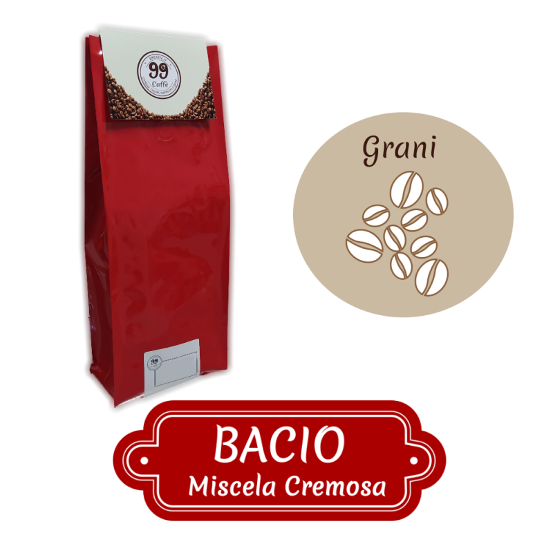 Bacio è la miscela "SuperCremosa" di 99 caffè. Nasce dal perfetto equilibrio tra Robusta e Arabica e racchiude in se Aromi, Corpo e Cremosità. È una miscela che sorprendente e già dal primo tentativo ci è "venuta al Bacio".
