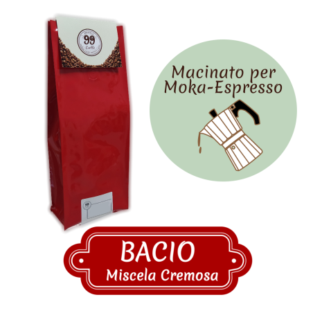 Bacio è la miscela "SuperCremosa" di 99 caffè. Nasce dal perfetto equilibrio tra Robusta e Arabica e racchiude in se Aromi, Corpo e Cremosità. È una miscela che sorprendente e già dal primo tentativo ci è "venuta al Bacio".
