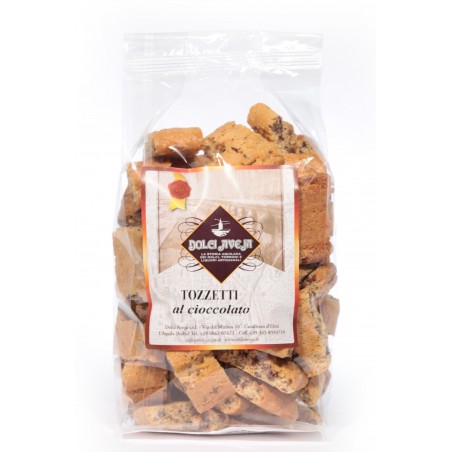 Biscottino tradizionale da gustare con un buon liquore a fine pasto, croccanti e friabili ritagliati a piccole losanghe, arricchito di gocce di cioccolato fondente puro.