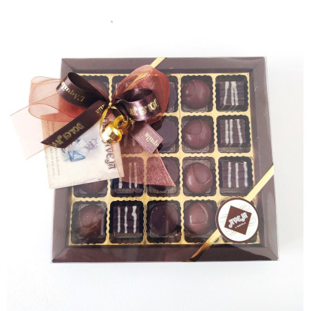 Scrigni di cioccolato al latte o fondente puro che racchiudono un cuore di deliziose creme al gusto unico dei Liquori Aveja, di nostra produzione (come genziana e ratafià, i più tipici della terra aquilana) o al caffè di “99 Caffè”, tostato direttamente da noi, o alla nocciola. Lavorazione completamente artigianale.