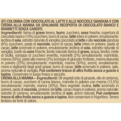 Colomba con cioccolato alla gianduia e con crema alla manna da spalmare, ricoperta di cioccolato bianco e colata di mannetti.