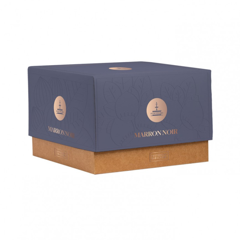 Panettone Marron Noir, con canditi di marroni e cioccolato alla gianduia ricoperto con crema di marroni e copertura al cacao ma