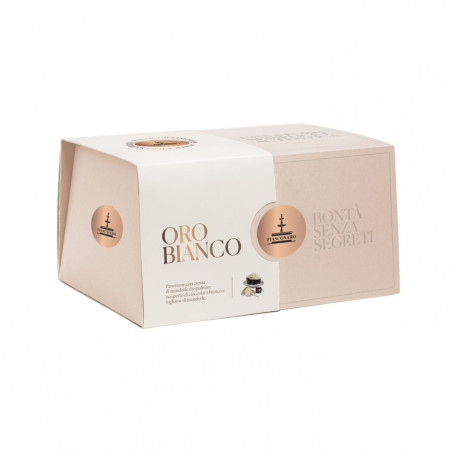 Panettone Oro Bianco, con crema di mandorla da spalmare, ricoperto di cioccolato bianco e fogliame di mandorle, senza uvetta e