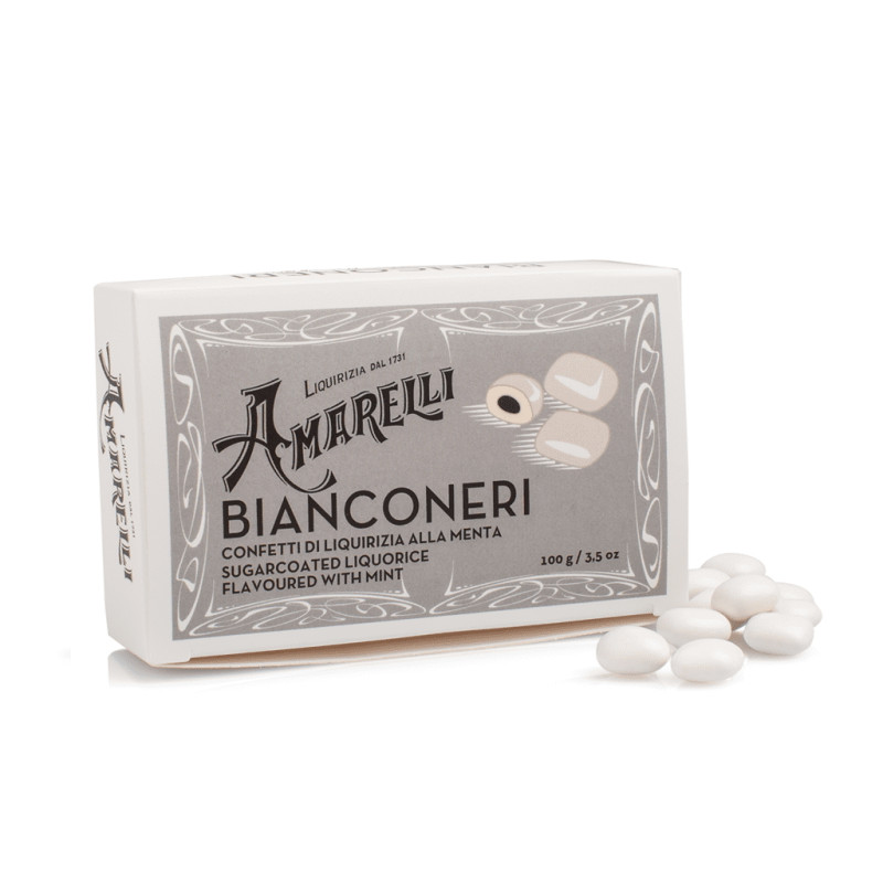 Amarelli - Bianconeri Confetti di Liquirizia alla Menta - Confezione da 100 gr. Classico ed elegante astuccio in cartone, ideale per il consumo familiare. Contiene “Bianconeri” Favette di liquirizia alla menta confettata con un sottile strato di zucchero