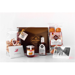Pacco Regalo contenente: Confettura Extra di albicocca Offidius 220g Zafferano in bustina DOP dell'Aquila 0,3g Tozzetti Cioccolato 200g Amaretti 200g Liquore Amaro Abruzzese 10 cl