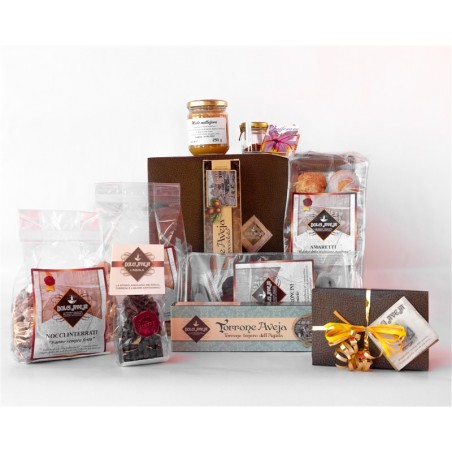Pacco Regalo contenente: Amaretti 350g Tartuffi Neri 350g Torroncini al miele in ballottin regalo 200g Torrone Aquilano 200g Torrone Nocciolato 200g Ferratelline cioccolato fondente 100g Miele millefiori Abruzzo 250g Zafferano Papaoli 0,3g Nocci interrati 350g Tozzetti Cioccolato 350g